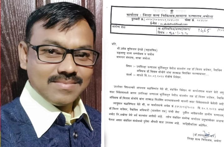 महाराष्ट्र राज्य रुग्णसेवक व श्रमिक कामगार संघटना महाराष्ट्र राज्य महासचिव उमेश सुरेशराव इंगळे यांच्या मागणीला यश आले असून अश्या कामचुकार डॉक्टर वर कारवाई करण्यात आल्याबद्दल नागरिकांनी उमेश सुरेशराव इंगळे यांचे आभार मानले.