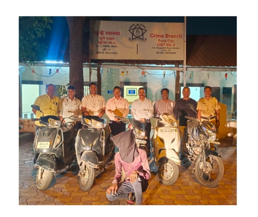 गुन्हे शाखा युनिट ४, पुणे शहर कडील नेमलेले पथकाने तात्काळ बातमीचे ठिकाणी जावुन सापळा रचुन पाहनचौर आरोपी गोविंदराज ऊर्फ गोविंद माधवराव वाघमारे रा. सनसवाडी, बापु दरेकर बिल्डिंग, एच.पी. पेट्रोल पंपाचे समोर, ता. शिरूर, जि.पुणे मुळ रा. मु.पो. जांभळीगाव, ता. मुखेड, जि. नांदेड यास चोरीच्या अॅक्टिव्हासह ताब्यात घेतले ताब्यातील आरोपीकडे गुन्हे शाखा युनिट ४ कडील पथकाने कौशल्यपूर्ण तपास करून एकुण ६ गुन्हे उघडकीस आणले ते पुढीलप्रमाणे. १) पोलीस ठाणे येरवडा ९८ / २०२३, २) पोलीस ठाणे येरवडा ९९ / २०२३, ३) पोलीस ठाणे कोरेगाव पार्क ७९/ २०२२, ४) पोलीस ठाणे दिघी ३२२/२०२२, ५) पोलीस ठाणे निगडी ४०६ / २०२२, ६) पोलीस ठाणे लोणी काळभोर १०४ / २०२३ ताब्यातील आरोपीकडुन वर नमुद एकुण ६ गुन्ह्यामध्ये चोरी केलेली एकुण २,८०,०००/- रु. ची चाहने जप्त करण्यात आली आहेत. सदर आरोपीतास पुढील तपासकामी पोलीस ठाणे येरवडा यांचे ताब्यात देण्यात आले आहे.