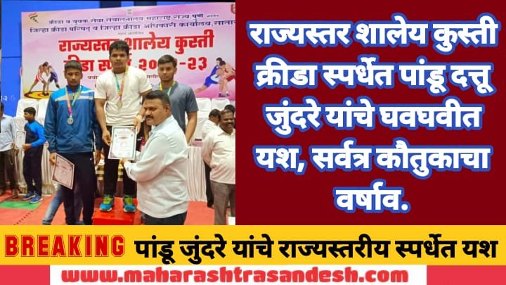 महाराष्ट्र संदेश न्युज ! ऑनलाईन इगतपुरी:- शालेय शिक्षण व क्रीडा विभाग, क्रीडा व युवक सेवा संचालनालय महाराष्ट्र राज्य पुणे, जिल्हा क्रीडा परिषद व जिल्हा क्रीडा अधिकारी कार्यालय सातारा वतीने आयोजित राज्यस्तर शालेय कुस्ती क्रीडा स्पर्धा 2022-23 चे श्रीमंत छत्रपती शाहू जिल्हा क्रीडा संकुल सातारा येथे 17 ते 19 फेब्रुवारी ला आयोजन करण्यात आले होते. या स्पर्धेत इगतपुरी तालक्यातील श्री. गोरेश्वर माध्यमिक व उच्च माध्यमिक विद्यालय गोरेगाव या शाळेत 10 व्या वर्गात शिकणाऱ्या पांडू दत्तू जुंदरे याने 71 कीलोवजनी गटाच्या फ्री स्टाईल कुस्ती स्पर्धेत घवघवीत यश प्राप्त केले.