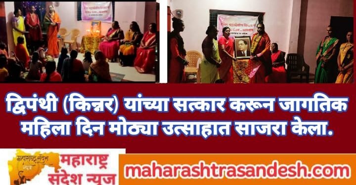 महाराष्ट्र संदेश न्युज ! ऑनलाईन वाशिम:- जागतिक महिला दिनानिमित्त सर्विकडे कर्तृत्ववान महिलांचा सत्कार करण्यात आला. नेतृत्ववान, कर्तृत्ववान अशा महिलांचा गौरव होणे म्हणजे त्यांच्या कलागुणांना वाव मिळणे असे होते. पण इंदिरा बहुउद्दशीय शिक्षण प्रसारक मंडळ मालेगाव संस्थेच्या अध्यक्षा सीमा सुरोशे यांनी आज समाजाला नवीन आयाम घालून दिला. त्यांनी या जागतिक महिला दिनानिमित्त कर्तुत्ववान द्विपंथी (किन्नर) यांच्या सत्कार करून जागतिक महिला दिन मोठ्या उत्साहात साजरा केला.