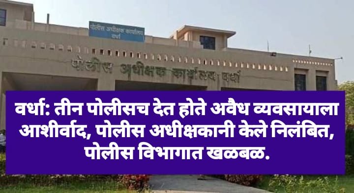 वर्धा शहरातील अवैध धंदे वाल्यांशी अर्थपूर्ण संबंध प्रस्थापित करून त्यांना या अवैध धंदे करण्यास आशीर्वाद दिल्याचा आरोप वर्धा येथील तीन पोलीस कर्मचाऱ्यावर करण्यात आला होता. जिल्हा पोलिस अधीक्षक नुरुल हसन यांच्या समोर हे प्रकरण येताच त्यांनी या तीन पोलीस कर्मचाऱ्यांना तत्काळ कारवाई करत निलंबित केले. त्यामुळे पोलीस प्रशासनात एकच खळबळ माजली आहे. पवन देशमुख, धीरज राठोड, राकेश इतवारे असे निलंबित करण्यात आलेल्या पोलिसांची नावे आहे.