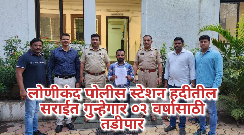 लोणीकंद पोलीस स्टेशन हद्दीतील माडेबोल्हाई, अष्टापुर फाटा तरोब आसपासच्या भागात दहशत निर्माण करून लोकांना तसेच सामान्य नागरीकांना वारंवार त्रास देणाऱ्या, दहशत निर्माण करून लोकांच्या जिवीतास धोका निर्माण करणाऱ्या सराईत गुन्हेगाराच्या कृत्यामुळे लोकांच्या मनातुन कायद्याविषयी संभ्रम निर्माण होवु नये तसेच सदर सराईत गुन्हेगारावर कायद्याचा वचक बसावा या उद्देशाने सदर इसमावर मा. सहा. पोलीस आयुक्त श्री किशोर जाधव लोणीकंद पोलीस स्टेशनचे वरिष्ठ पोलीस निरीक्षक, श्री गजानन पवार, पोलीस निरीक्षक गुन्हे श्री मारुती पाटील, यांचे मार्गदर्शनाखाली पोलीस उपनिरीक्षक रामकृष्ण दळती पोलीस नाईक प्रशांत कापुरे, सागर कडु यांनी सदर सराईत इसम याचेवर दाखल गुन्ह्यांचा अभिलेख तपासुन सदर इसम यास महाराष्ट्र पोलीस कायदा कलम ५६ प्रमाणे तडीपार करणेबाबत पोलीस उप आयुक्त श्री शशिकांत बोराटे यांना प्रस्ताव पाठविला असता श्री शशिकांत बोराटे यांनी सदर सराईतास पुणे जिल्ह्यावे हद्दीतून दोन वर्षाकरीता तडीपार केले आहे.