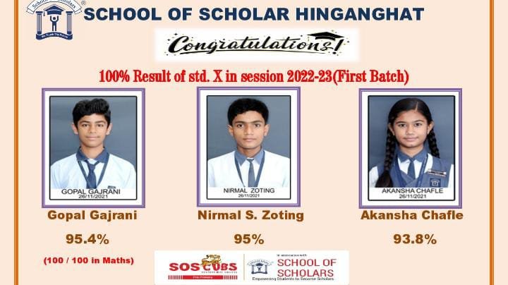 स्कूल ऑफ स्कॉलर्स हिंगणघाट मधील गोपाल गजरानी या विद्यार्थ्याने ९५.४०% गुण मिळवून शाळेतून पहिला क्रमांक पटकावीला, निर्मल झोटिंग याने ९५% गुण मिळवून दुसरा क्रमांक पटकाविला त्याच प्रमाणे कु. आकांशा चाफले ९३.८०% गुण मिळवून तिसरा क्रमांक पटकावीला. गोपाल गजरानी या विद्यार्थ्याला गणितात १०० पैकी १०० गुण मिळाले आहेत. तर निर्मल झोटिंगला सामाजिकशास्त्र या विषयात १०० पैकी ९८ गुण मिळाले आहेत. सर्व विद्यार्थ्यांचे शाळा प्रशासनाने व मुख्याध्यापिका शिल्पा चव्हाण, प्रशासकीय अधिकारी प्रदीप जोशी, शिक्षण समन्वयक संतोषी बैस आणि संपूर्ण शिक्षक शिक्षकेत्तर कर्मचाऱ्यांनी अभिनंदन केले व पुढील वाटचालीस शुभेच्छा दिल्या.