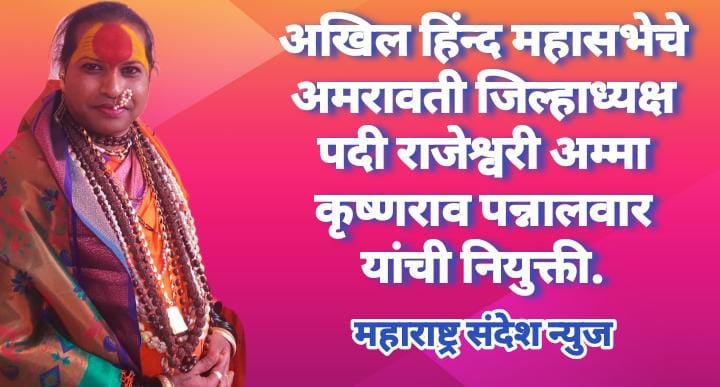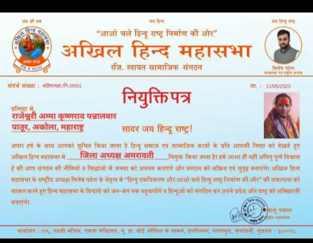 अखिल हिन्द महासभेच्या अमरावती जिल्हाध्यक्ष पदी राजेश्वरी अम्मा कृष्णराव पन्नालवार यांची नियुक्ती.