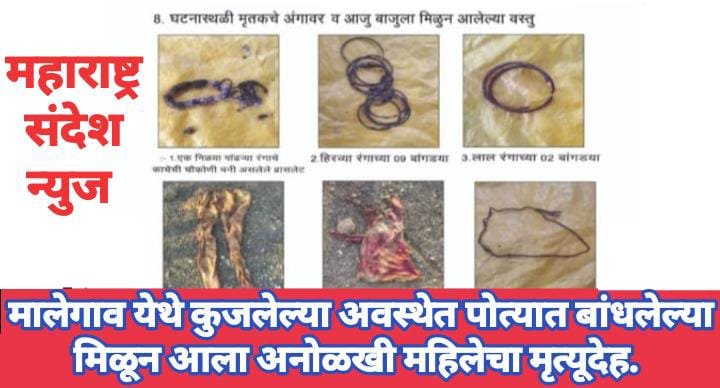 महाराष्ट्र संदेश न्युज ! ऑनलाईन मालेगाव;- पोलीस स्टेशन हद्दीतील खवले वेटाळ ते इराळा जाणाऱ्या पांदण रोडवरील शिवारात एका नाल्यात अनोळखी महिलेचा मृतदेह कुजलेल्या अवस्थेत पोत्यात बांधलेल्या सापडल्याने तालुक्यामध्ये खळबळ उडाली असून घटनेची माहिती समजताच मालेगाव पोलीस ठाण्याचे पोलीस निरीक्षक दत्तात्रय आव्हळे यांनी आपल्या पोलीस कर्मचाऱ्यासह घटनास्थळी भेट दिली.