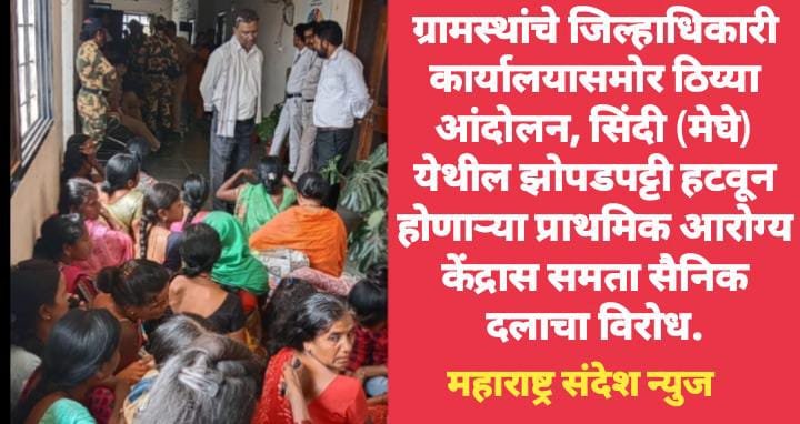 महाराष्ट्र संदेश न्युज ! ऑनलाईन वर्धा:- आज अचानक सिंदी मेघे येथील रहवासी महिलांनी आपल्या मागण्या साठी वर्धा जिल्हाधिकारी यांच्या कार्यालयाबाहेर ठीया आंदोलन केले, यामुळे काही वेळ प्रशासनात एकच खळबळ माजली होती. नियम बाह्यरित्या बेघर करण्याची प्रक्रिया थांबविण्या बाबतचे निवेदन समता सैनिक दल वर्धा जिल्हा युनिटच्या वतीने जिल्हाधिकारी वर्धा यांना सोमवार दि.22 मे 2023 ला सादर करण्यात आले.