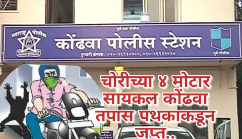 पोलीस ठाणे गुरन ४१ / २०२३ भादवि कलम ३७९ प्रमाणे गुन्हा दाखल असल्याची माहिती प्राप्त झाली आहे. तसेच दि. १७/०५/२०२३ रोजी शिवनेरी भागात पेट्रोलिंग करत असताना संशयीत रित्या विधी संघर्षग्रस्त बालक हा डिओ मोटार सायकल एम.एच.१२ एफ.एच.३४६७ ही घेवून जात असताना पोलीस अंम विकास मरगळे व जयदेव भोसले यांना दिसला. सदर मो.सा. बाबत त्याच्याकडे तपास करता त्याने सदर मो.सा. ही शिवनेरीनगर गल्ली नं. २० येथुन चोरी केल्याचे सांगितले त्याने अधिक मो.सा. चोरी केल्या असल्याबाबत संशय वाटत असल्याने त्याबाबत त्याच्याकडे चौकशी केली असता त्याने भाग्योदयनगर गल्ली नं.०४ अँटिव्हा टू व्हिलर मोटार सायकल एम.एच.१३. बी. एम. ६६६५ ही चोरी केल्याची कबुली दिली आहे. वरिल दोन्ही मोटार सायकल बाबत कोंढवा पोलीस ठाणे येथे गुरन ४६३ / २०२३ भादवि कलम ३७९ व गुरन ४४६ / २०२३ भादवि कलम ३७९ प्रमाणे दाखल असणारे गुन्हे उघड झाले आहे. तसेच दि.२२/०५/२०२३ रोजी भाग्योदयनगर भागात पेट्रोलिंग करत असताना पोलीस अंम. सुहास मोरे व राहुल थोरात संशयीत रित्या विधीसंघर्षग्रस्त बालक याच्याकडे युनिकॉन मोटार सायकल एम.एच.१२ आर.डी. ७२५५ ही मो सा मिळुन आली होती. सदर मो.सा. बाबत त्याच्याकडे तपास करता त्याने सदर मो.सा. ही मिठानगर, कोंढवा येथुन चोरी केल्याचे सांगितले. वरिल मोटार सायकलबाबत कोंढवा पोलीस ठाणे येथे गुरन.४८१ / २०२३ भादवि कलम ३७९ प्रमाणे दाखल असणारे गुन्हे उघड झाले आहे. वरिल १ आरोपी व २ विधसंघर्षग्रस्त बालक यांच्याकडुन एकुण ४ चोरीच्या मोटार सायकल एकुण १ लाख रुपये किंमतीच्या जप्त करण्यात आलेल्या आहे. उघड झालेले गुन्हे पुढीलप्रमाणे