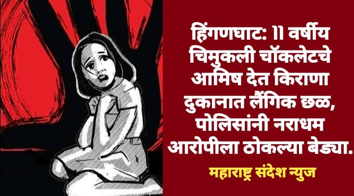 महाराष्ट्र संदेश न्युज ! ऑनलाईन हिंगणघाट:- येथून एक संतापजनक घटना समोर आली आहे. येथे एका 11 वर्षीय व अन्य एक अल्पवयीन चिमुकलीला चॉकलेटचे आमिष दाखवून किराणा दुकानात जबरदस्ती बोलावून दोन चिमुकलींचा लैंगिक छळ केल्याची घटना घडली. ही घटना समोर येतात संपूर्ण शहरात मोठ्या प्रमाणात संताप व्यक्त करण्यात येत आहे. दिनांक 6 जून रोजी हिंगणघाट पोलिसांनी या नराधमाला अटक केली आहे. राजेंद्र रामराव झाडे, रा.हिंगणघाट असे अटक केलेल्या आरोपांचे नाव आहे.