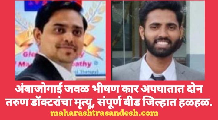 महाराष्ट्र संदेश न्युज ! ऑनलाईन बीड:- जिल्हातून एक भीषण अपघाताची घटना समोर आली आहे. अंबाजोगाई – येथून आडसकडे जाणाऱ्या रोडवर कार झाडाला धडकून झालेल्या भीषण अपघातात झाला या भीषण अपघातात अंबाजोगाई येथील डॉ. प्रमोद राजाभाऊ बुरांडे वय 39 वर्ष आणि डॉ. रवी संतोष सातपुते वय 38 वर्ष यांचा दुर्दैवी मृत्यू झाला.