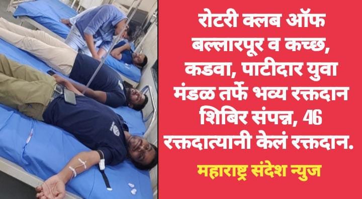 महाराष्ट्र संदेश न्युज ! ऑनलाईन बल्लारपूर, 11 जून:- सामुदायिक एकतेच्या उल्लेखनीय प्रदर्शनात, रोटरी क्लब ऑफ बल्लारपूरने कच्छ कडवा पाटीदार युवा मंडळ बल्लारपूर यांच्याशी हातमिळवणी करून आरएच, बल्लारपूर येथे यशस्वी रक्तदान शिबिराचे आयोजन करण्यात आले होते. यावेळी आयोजकांचे उद्दिष्ट प्रदेशातील रक्तदानाच्या गरजेकडे लक्ष वेधणे व समुदायाच्या सदस्यांना पुढे जाण्यासाठी आणि जगामध्ये आशा निर्माण करण्यासाठी प्रेरित करणे हे होते. रक्तदात्यांच्या उदंड प्रतिसादामुळे शिबिरात एकूण 46 रक्त युनिट संकलित करण्यात आले.