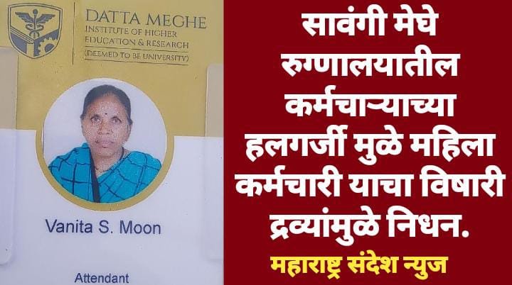 माजी खासदार दत्ता मेघे यांच्या आचार्य विनोबा भावे ग्रामीण रुग्णालय सावंगी मेघे येथील रुग्णालयातील महिला कर्मचारी वनिता रामप्रसाद हिवरकर रा. समता नगर वर्धा या रूग्णालयात परिचारिका या पदावर काम करित होते. काम करत असताना दी, 30 मे 2023 रोजी मंगळवार ला 1/8 या वेळात काम करित असताना. इंचार्ज यांनी वनिता हिवरकर यांना फ्युमिकेशनची बंद रूम मध्ये कीटानू मारण्याकरिता प्रक्रिया करण्यास सांगितले परंतु फ्युमिकेशन हे अति विषारी असल्यामुळे ते जाणकार डॉक्टरच्या निगराणीत मध्ये संरक्षण साधनाचा वापर करूनच केल्या जातो परंतु तिथे कर्मचाऱ्यानी वनिता हिवरकर यांना कोणतेही प्रकारची सुरक्षा साधने दिलेली नसताना त्याच्या कडून जोर जबरदस्तीने हे धोकादायक काम करून घेण्यात आले. त्यामुळे त्याच्या शरीरात हे विषारी औषध गेलेमुळे त्याची प्रकृती गंभीर झाली. त्यांना तातडीने रुग्णालयात दाखल करण्यात आले पण रुग्णालयात त्यांचं दुर्दैवी निधन झाले. अशा गंभीर आरोप मृतक महिलेचा कुटुंबाने केला.
