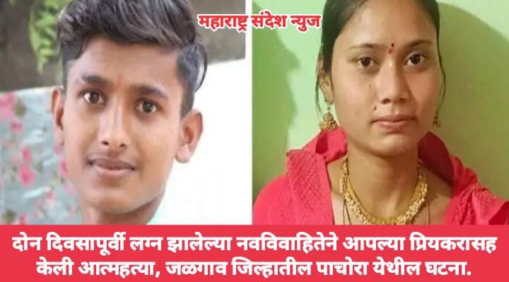 महाराष्ट्र संदेश न्युज ! ऑनलाईन जळगाव:- जिल्हातील पाचोरा येथून एक खळबळजनक घटना समोर आली आहे. दोन दिवसांपूर्वी म्हणजेच 23 जून शुक्रवारीला लग्न झालेल्या नवविवाहितेने आपल्या प्रियकरासह आत्महत्या केली. ही घटना पाचोरा येथे सिंधी कॅम्प परिसरातील एका पडक्या शाळेत रविवारी रात्री घडली. साक्षी सोमनाथ भोई वय 18 वर्षे आणि जितेंद्र राजेंद्र राठोड वय 18 वर्षे, दोघेही रा. वरखेडी नाका, पाचोरा अशी या आत्महत्या केलेल्या प्रेमीयुगुलाचे नाव आहे. ही प्रेमी युगुलाच्या आत्महत्येची घटना समोर येताच संपूर्ण जिल्हात एकच खळबळ माजली आहे.