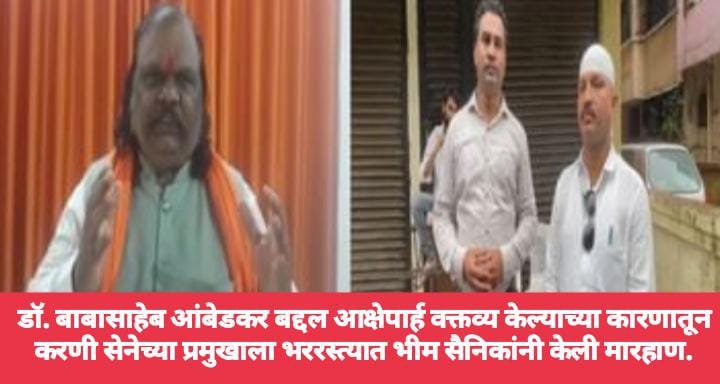महाराष्ट्र संदेश न्युज ! ऑनलाईन पनवेल:- डॉ. बाबासाहेब आंबेडकर यांच्याबद्दल आक्षेपार्ह वक्तव्य केल्याच्या कारणावरून भीमशक्ती संघटनेच्या कार्यकर्त्या कडून करणी सेनेच्या प्रमुखाला भर रस्त्यात चांगला धडा शिकवत मारहाण केल्याची खळबळ जनक घटना समोर आली आहे.
