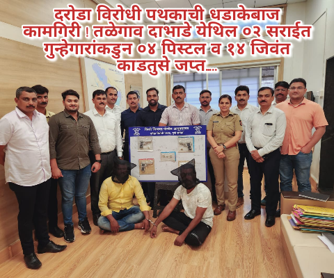त्याअनुषंगाने पोलीस निरीक्षक जितेंद्र कदम यांचे अधिपत्याखाली सहाय्यक पोलीस निरीक्षक अंबरिष देशमुख, पोलीस नाईक १४५८. आशिष बनकर, पोलीस नाईक १२३४ प्रविण कांबळे, पोलीस नाईक १७२२ गणेश कोकणे, पोलीस नाईक १०६२ गणेश हिंगे, पोलीस शिपाई २६४३ गणेश सावंत, पोलीस शिपाई २९४७ विनोद वीर व पोलीस शिपाई २६७३ सुमित देवकर या पथकाने दि. २५/०६/२०२३ रोजी २०/१५ वा दरम्यान तळेगाव दाभाडे एस टी बस स्टैण्ड परिसरामध्ये सापळा लावला असताना सराईत आरोपी नामे १). प्रमोद सोपान सांडभोर वय ३३ वर्षे, रा तळेगाव स्टेशन जवळ, हरणेश्वर बाडी, बौध्द विहार जवळ, तळेगाव दाभाडे, पुणे २) शरद मुरलीधर साळवी, वय- ३० वर्षे रा धनगर बाबा मंदीर मागे ज्ञानेश्वर कॉलनी, काळेवाडी पुणे मुळ रा- महारवाडा, अवहातरबाला, बदनापुर, जालना हे त्याठिकाणी एका निळया रंगाच्या मारुती सुझुकी ऑल्टो कार मध्ये येवुन खाली उतरले. पोलीसांनी त्यांना पकडणेकरीता सापळा लावले असल्याचे त्यांचे लक्षात आल्यावर नमुद आरोपी हे वेगवेगळ्या दिशेने पळुन जाण्याच्या प्रयत्नात असताना नगुद पथकाने अतिशय शिताफीने त्यांचा पाठलाग करुन ताब्यात घेतले. सदर दोन्ही आरोपी यांची झडती घेतली असता त्या दोघांनीही त्यांचे कमरेस लोखंडी गावठी पिस्टल खोचलेले असल्याचे व त्यामध्ये प्रत्येकी ०२ जिवंत काडतुसे (राऊंड) असल्याचे दिसुन आले तसेच नमुद आरोपी ज्या मारुती सुझुकी ऑल्टो कार धुन आलेले होते. त्या कारची पाहणी केली असता सदर कार मध्ये ०२ लोखंडी गावठी पिस्टल व १० जिवंत काडतुसे (राऊड) मिळुन आले. त्यांचेकडुन ५,६०,००० /- रुपये किंमतीचे ०४ गावठी पिस्टल, 19,००० /- रुपये किंमतीचे १४ जिवंत काडतुसे (राऊंड) व १,००,०००/- रुपये किंमतीची मारुती सुझुकी ऑल्टो कार ही जप्त करण्यात आलेली आहे.