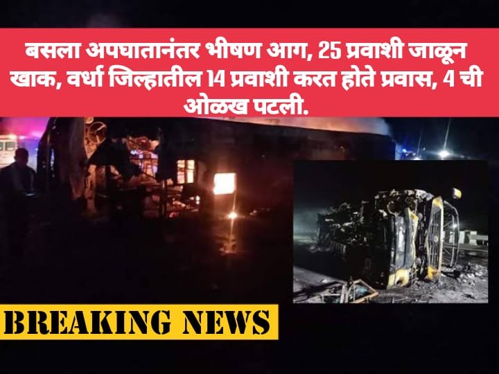 समृद्धी महामार्गावर बुलढाणा जिल्ह्यातील सिंदखेडराजा येथील पिंपळखुटा भागातील घटना आहे. बसमध्ये 33 प्रवाश्या पैकी 25 लोकांचा मृत्यू झाला असून त्यात वर्धा जिल्हातील 14 प्रवाशी प्रवास करत होते.