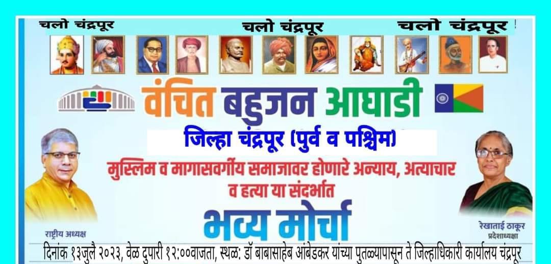 महाराष्ट्र संदेश न्युज ! ऑनलाईन चंद्रपूर:- बौद्ध मातंग, मुस्लिम सह सर्व वंचित बहुजन समाजा वरील अत्याचाराच्या विरोधात गुरुवार दिनांक 13 जुलै 2023 रोजी दुपारी बारा वाजता वंचित बहुजन आघाडीच्या वतीने प्रचंड जनआक्रोश मोर्चाचे आयोजन करण्यात आले आहे. सदर मोर्चा डॉ. बाबासाहेब आंबेडकर पुतळ्यापासून जिल्हाधिकारी कार्यालय चंद्रपूर वर धडकेल. वंचित बहुजन आघाडी चंद्रपूर पूर्व आणि पश्चिम जिल्ह्याच्या वतीने या प्रचंड जन आक्रोश मोर्चाचे आयोजन करण्यात आले आहे.