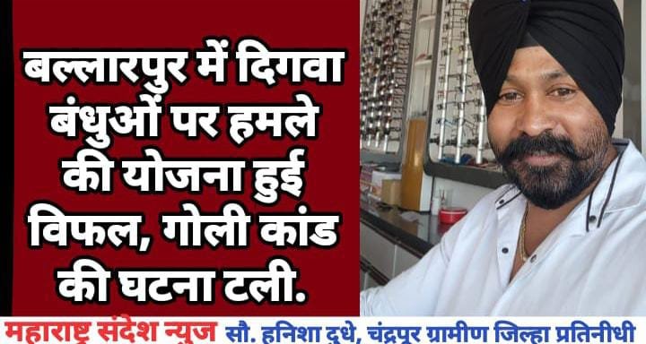 महाराष्ट्र संदेश न्युज ! ऑनलाईन बल्लारपुर:- शहर के प्रख्यात शशी डेवलपर्स व प्रापर्टी डीलर दिगवा बंधुओं पर गुरुवार की रात दस बजे के करीब गोल पुलिया के पास एक परिचित नायडू से बातचीत करने के लिए रुकने के दौरान एक दुपहिया में नकाबपोश (मुंह पर दुपट्टा बांधे) तीन अज्ञात युवक अश्लील गाली देते हुए कमर के पीछे से गण जैसी चीज निकालते देख मनमोहनसिंह गुरुदयाल सिंह दिगवा व त्रिलोकचंद्र सिंह दिगवा अपनी बुलेट मोटर साइकिल की स्पीड बढ़ाकर भाग निकलने में सफल होने से जान बची है, अज्ञात युवक भी अपनी दुपहिया से बस्ती में स्थित गांधी पुतले तक पिछाकर दुबारा गोली मारने की धमकी देते हुए रफूचक्कर हुए है इस घटना की शिकायत बल्लारपुर पुलिस स्टेशन में जाकर दर्ज करवाई है.