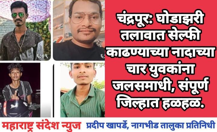 महाराष्ट्र संदेश न्युज ! ऑनलाईन नागभीड:- चंद्रपूर जिल्हातून एक दुर्दैवी घटना समोर आली आहे. सेल्फी काढण्याच्या नादाच्या चार युवक घोडझरी तलावात बुडाल्याची माहिती समोर आली आहे. त्यामुळे संपूर्ण जिल्हात हळहळ व्यक्त करण्यात येत आहे.