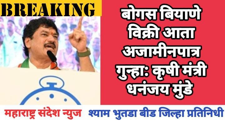 महाराष्ट्र संदेश न्युज ! ऑनलाईन बीड:- राज्यात बोगस बियाणे, खते, कीटकनाशके यांची विक्री करणाऱ्या काही जणांवर अलीकडे कारवाई झाली आहे, मात्र बोगस बियाणे-औषधे विक्री करणाऱ्यांविरोधात अधिक कडक कायदा करण्याचा निर्णय मंत्रिमंडळाने घेतला असून, चालू पावसाळी अधिवेशनातच बोगसगिरी करणाऱ्यांवर अजामीनपात्र गुन्हा दाखल करण्याचा अधिक कडक कायदा अस्तित्वात आणला जाईल, अशी माहिती राज्याचे कृषिमंत्री धनंजय मुंडे यांनी आज मुंबई येथे पावसाळी अधिवेशनाच्या पहिल्या दिवसाचे कामकाज संपल्यानंतर माध्यमांशी बोलताना दिली.