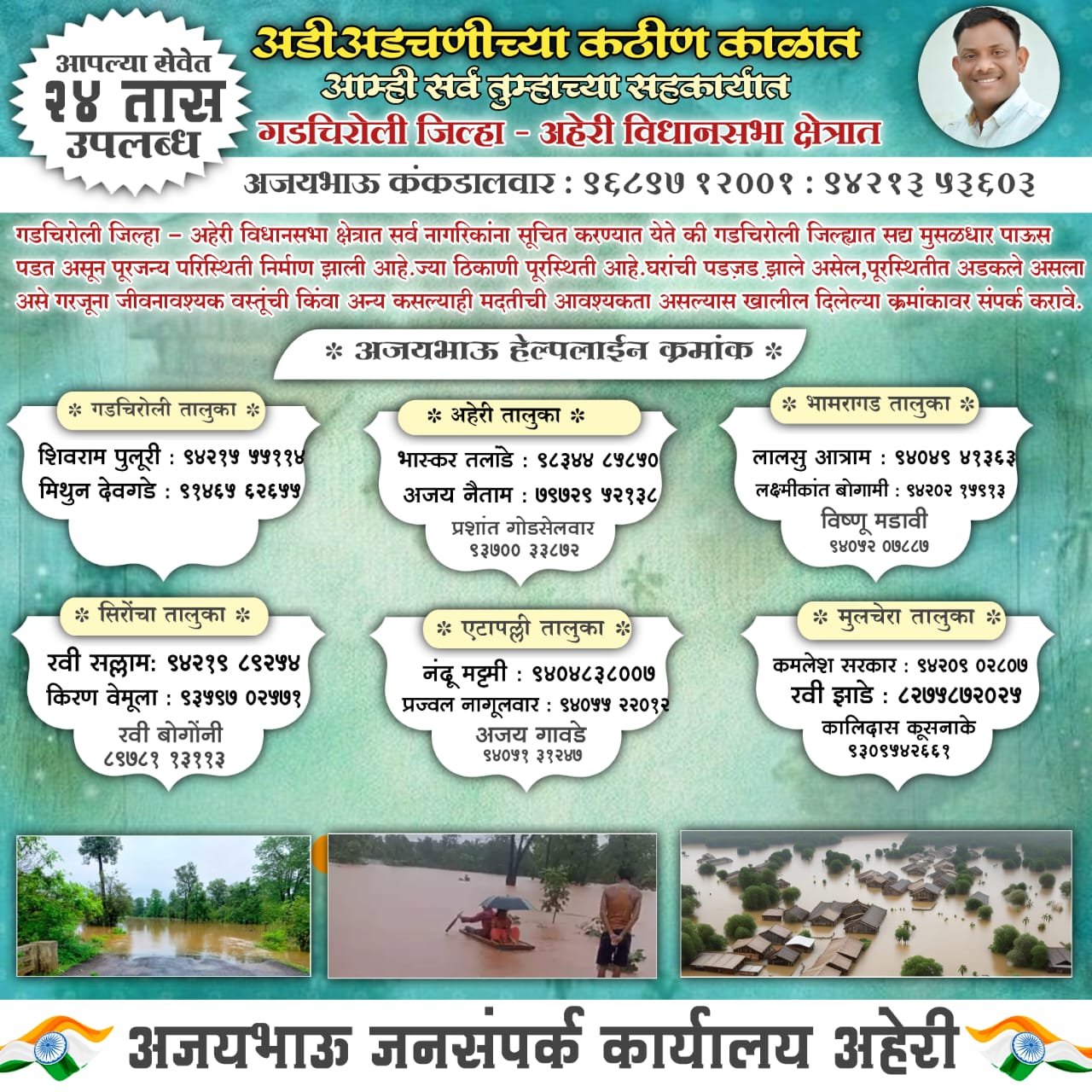 अजयभाऊ जनसंपर्क कार्यालय गडचिरोली / अहेरी (9689712001, 9421353603), गडचिरोली तालुका- शिवराम पुलूरी-9421555114, मिथुन देवगडे-9146562655, अहेरी तालुका – भास्कर तलांडे 9834485850, अजय नैताम 7972952138 प्रशांत गोडसेलवार 9370033872, भामरागड तालुका – विष्णू मडावी 9405207887, लक्ष्मीकांत बोगामी 9420215913 लालसु आत्राम- 9404941363, सिरोंचा तालुका रवी सल्लाम 9421989254, किरण वेमुला 9359702571, रवी बोगोंनी 9405586739, नागराजू इंगली 9405117412, एटापल्ली तालुका – नंदू मट्टामी 9404838007, प्रज्वल नागुलवार 9405522012 अजय गावडे 9405131247, मुलचेरा तालुका – कालिदास कुसनाके 9309542661 रवी झाडे 8275872025, कमलेश सरकार 9420902807 कुणाल हलदार