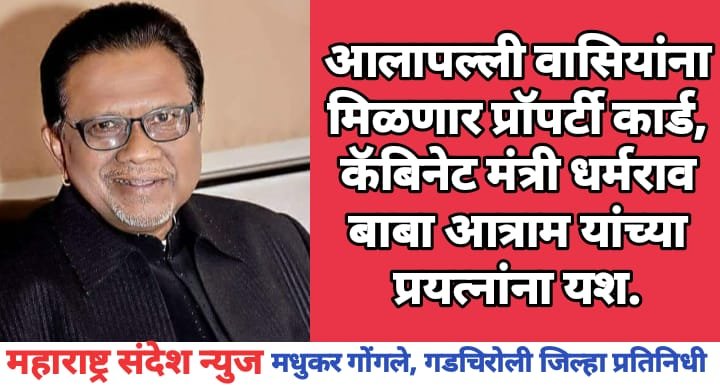 महाराष्ट्र संदेश न्युज ! ऑनलाईन अहेरी:- कॅबिनेट मंत्री धर्मराव बाबा आत्राम यांच्या प्रयत्नांना यश आले असून तालुक्यातील आलापल्ली वासीयांना आता मालमत्ता पत्रक (प्रॉपर्टी कार्ड) मिळण्याचा मार्ग मोकळा झाला आहे.