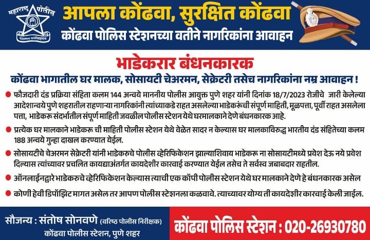आज मालमत्ता भाड्याने देणाऱ्या एजंटची कोंढवा पोलीस स्टेशन येथे मीटिंग घेऊन त्यांना दिलेल्या भाडेकरू ची माहिती दिलेल्या नमुना फॉर्म त्याच्यासोबत आधार कार्ड, पॅन कार्ड, ड्रायव्हिंग लायसन, पासपोर्टची झेरॉक्स तसेच रजिस्टर भाडेकरारनामा इत्यादी कागदपत्र पोलीस स्टेशन येथे जमा करण्याबाबत सूचना देण्यात आलेले आहे. तसेच पोलीस स्टेशन हद्दीमध्ये ठीक ठिकाणी बॅनर लावण्यासाठी तसेच पॅम्प्लेट लावण्यासाठी वाटप करण्यात आलेले आहेत तसेच बॅनर तसे पॅम्प्लेट पोलीस स्टेशन हद्दीमध्ये ठीक ठिकाणी लावण्यात आलेले आहेत. आम्ही खबरदारी घेत आहोत शहरात कुठलीही अनुचित घटना घडू नये म्हणून सर्वांनी यात सहयोग्य करावा अशी माहिती संतोष सोनवणे वरिष्ठ पोलिस निरीक्षक कोंढवा पोलीस स्टेशन पुणे यांनी महाराष्ट्र संदेश न्युज बरोबर बोलताना दिली.