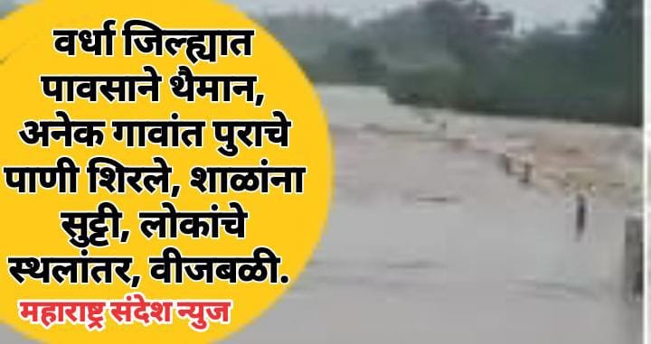 महाराष्ट्र संदेश न्युज ! ऑनलाईन वर्धा:- जिल्ह्यात पावसाने 2 दिवसापासून अक्षरशः थैमान घातले आहे. जिल्ह्यातील सर्व नदी आणि नाले दुथडी भरून वाहत असून पूरस्थिती निर्माण झाली आहे. अनेक गावांत पुराचे पाणी शिरले आहे. त्यामुळे या गावाचा मुख्यालयाशी संपर्क तुटला आहे. प्रशासनाने नदीकाठच्या गावांना सतर्कतेचा इशारा दिला आहे. रात्री उशिरापर्यंत पावसाची रिपरिप सुरू राहिली. जिल्ह्यात आणखी तीन दिवस पावसाचा मुक्काम राहणार असल्याचा अंदाज हवामान विभागाने वर्तविला आहे