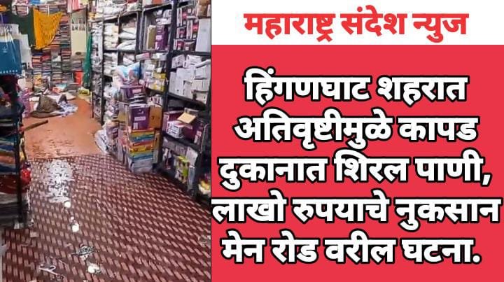 महाराष्ट्र संदेश न्युज ! ऑनलाईन हिंगणघाट:- दिनांक 26 जुलै बुधवार पासून सुरू असलेल्या अतिवृष्टीच्या पावसाने कहरच केला आहे. बुधवारी रात्री झालेल्या अतिवृष्टीच्या पावसामुळे मुख्य मार्गावरील पंजाब नॅशनल बँकेच्या समोर असलेल्या माहेश्वरी मॅचिंग, माहेश्वरी एन एक्स, माहेश्वरी क्लास स्टोअर्स या दुकानात नालाचे पाणी शिरल्याने त्या दुकानाच्या आत गुडघाभर पाणी जमा झाले. त्यामुळे दुकानात ठेवलेले महागडे कापड, कापड बॉक्स खाली ठेवलेले कपड्याचे वेगवेगळे साहित्य सर्व पाण्यामुळे ओले झाल्याने जवळपास 15 लाख रुपयांचा नुकसान झाल्याचे दुकान संचालक यांनी सांगितले.