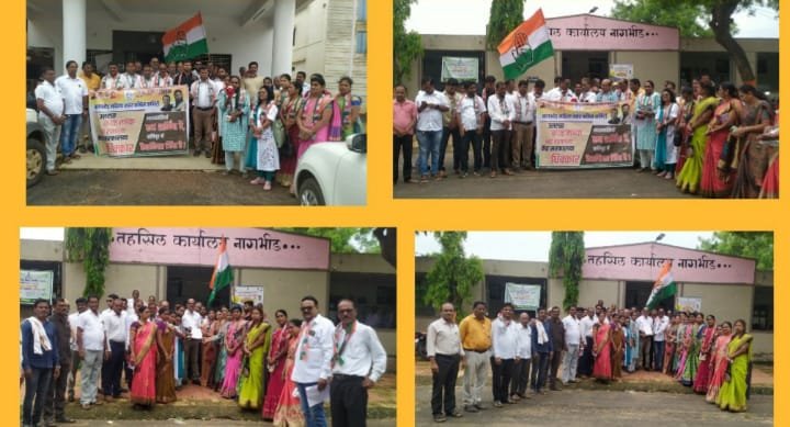 महाराष्ट्र संदेश न्युज ! ऑनलाईन नागभीड, दि.28 जुलै:- नागभीड तालुका व शहर काँग्रेस कमेटीच्या वतीने तहसिल कार्यालयावर केंद्र सरकार विरोधात निषेध आंदोलनाचे आयोजन केले होते. मणिपूर राज्यात आदिवासी कुकी महिलांची विटंबना करून त्यांच्यावर नराधमांनी अत्याचार केले. सदर महिलांवर होत असलेल्या आत्याचार व हिसांचार २ महिण्यांनंतर कालावधी होऊन सुध्दा नराधमांना अटक करण्यात आलेले नव्हते. अशा अनेक हिसांचाराच्या घटना दररोज मनिपुरमध्ये घडत आहे. देश जळत असताना केंद्र सरकार व राज्य सरकार मुंग गिळून गप्प आहे.