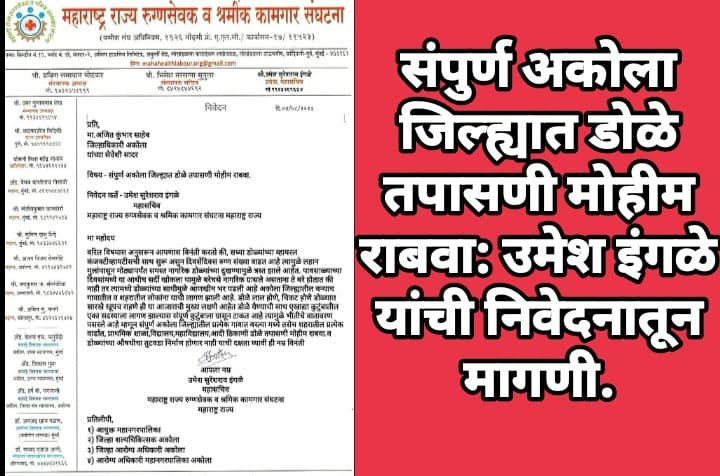 महाराष्ट्र संदेश न्युज ! ऑनलाईन अकोला:- जिल्ह्यातील ग्रामीण भागातील नागरिकांन सह संपुर्ण अकोला शहरातील नागरिक डोळ्यांच्या साथीमुळे बेजार झाले आहेत म्हणून संपुर्ण अकोला जिल्ह्यात डोळे तपासणी मोहीम राबवा अशी मागणी महाराष्ट्र राज्य रुग्णसेवक व श्रमिक कामगार संघटना महाराष्ट्र महासचिव उमेश सुरेशराव इंगळे यांनी जिल्हाधिकारी अजित कुंभार यांना दिलेल्या निवेदनाद्वारे केली आहे.