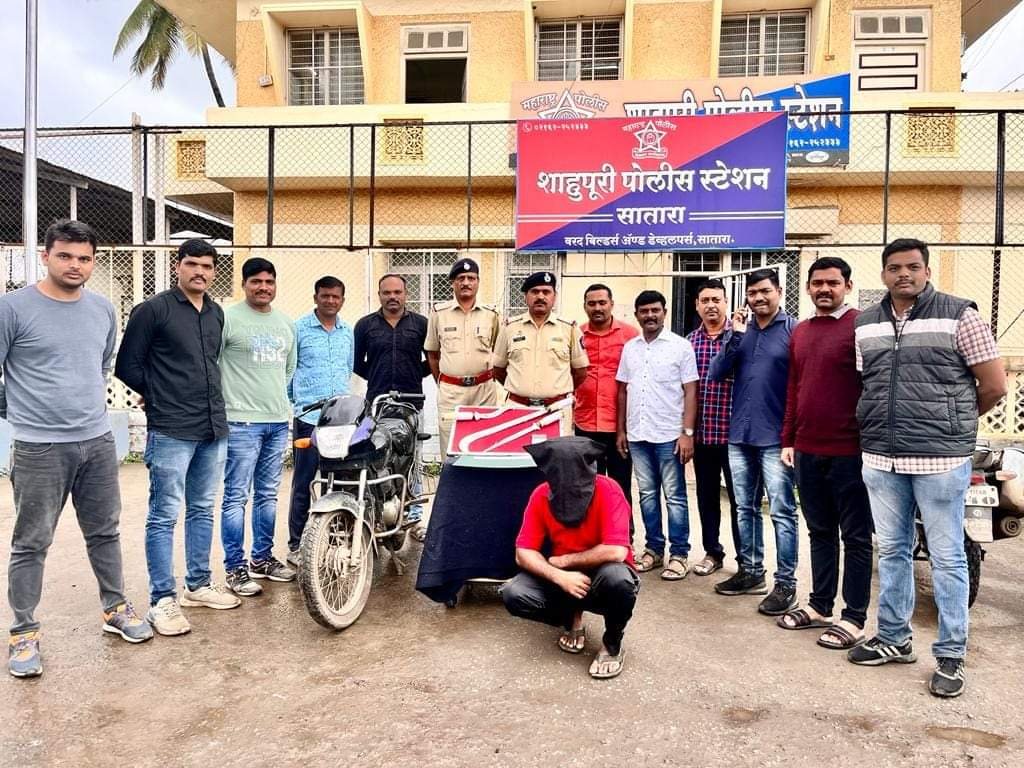 दि.04/08/2023 रोजी मा. पोलीस निरीक्षक श्री. धनंजय फडतरे यांना त्यांच्या गोपनीय बातमी दारामार्फत माहीती मीळाली की एक लालरंगाचा टि शर्ट घातलेला इसम काळे रंगाचे हिरो पेंशन मोटरसायल वरून पांढरे रंगाचे पोत्यामध्ये धारदार शस्त्र घेवुन दत्तकृपा मोटर गॅरेजचे समोर मोळाचा ओढा येथून जाणार आहे अशी खात्रीशीर बातमी मिळाल्याने सदर ठिकाणी गुन्हे प्रकटीकरण शाखेचे अंमलदार यांनी सापळा रचला. मिळाले बातमी प्रमाणे 19.00 वा. सदर वर्णनाचा इसम मोटरसायकलवरून येत असताना दिसला त्यास आम्ही पोलीस स्टाफने थांबण्याचा इशारा करून त्यास थांबवीले. सदर इसमास त्याचे नाव गाव विचारले असता त्याने त्याचे नाव विक्रम अशोक सांळुखे वय 24 वर्षे रा.नेले ता. जि. सातारा असे असलेचे सांगीतले त्यावेळी त्याचे जवळ असलेल्या पांढरे रंगाचे पोत्यात काय आहे असे विचारले असता त्याने उडवा उडवीची उत्तरे दिल्ली. म्हणून पांढरे रंगाचे पोते उघडुन पाहीले असता त्यामध्ये वेगवेगळया आकाराचा एक कोयता व दोन सुरे अढळुन आले त्यावेळी त्याचे जवळ मिळुन आलेल्या धारदार शस्त्रा बाबत त्याचे जवळ विचारणा केली असता त्याने कोणतेही समाधान कारक उत्तर दिले नाही. त्याचेजवळ असलेल्या धारदार शस्त्राबाबत त्याचेकडे कोनता परवाना आहे अगर कसे असे विचाले असता त्याचे जवळ शस्त्र बाळगणे बाबत कोणताही परवाना नसले बाबत सांगीतले. म्हणून सदर इसमास तब्यात घेवुन शाहुपुरी पोलीस ठाणे येथे आणुन त्याच्यावर आर्म अॅक्ट प्रमाणे गुन्हा नोंद करणेत आलेला आहे. अशा प्रकारे शाहुपुरी गुन्हेप्रकटिकरण शाखेने बेकायदेशीर शस्त्र बाळगणा-या इसमा कडुन 1 कोयता, 2 सुरे, मोबाईल व मोटारसायकल असा 29000/- रू. चा मुददेमाल जप्त करून त्याचे विरूद्ध शाहुपुरी पोलीस ठाणे येथे गुन्हा नोंद केलेला आहे.