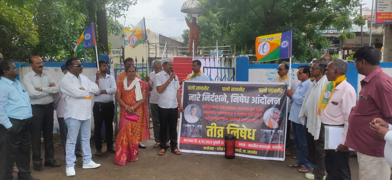 महाराष्ट्र संदेश न्युज ! ऑनलाईन सावनेर – 9 ऑगस्ट:- मणिपूर येथे महिलेवर अमानवीय कृत्य करणाऱ्या नराधमाना कठोर कार्यवाही करून फासी द्यावी व मनोहर भिडे यांनी महापुरुषांच्या बद्दल केलेले वक्तव्य कायदा,सुव्यवस्था भंग करून दंगली पेटविनारे आहे.या दोन्ही घटनेचा वंचित बहुजन आघाडी तर्फे तीव्र निषेध करित जिल्हाध्यक्ष विलास वाटकर यांच्या नेतृत्वात व पुर्व विदर्भ संयोजक भगवान भोंडे यांचा मार्गदर्शन मध्ये तहसील कार्यालय सावनेर समोर नारे निदर्शने करून उपविभागीय अधिकारी संपत खलाटे यांच्या मार्फत पंतप्रधान यांना निवेदन देण्यात आले. तसेच कायद्यानुसार योग्य ती कार्यवाही लवकरात लवकर व्हावी अशी मागणी करण्यात आली.