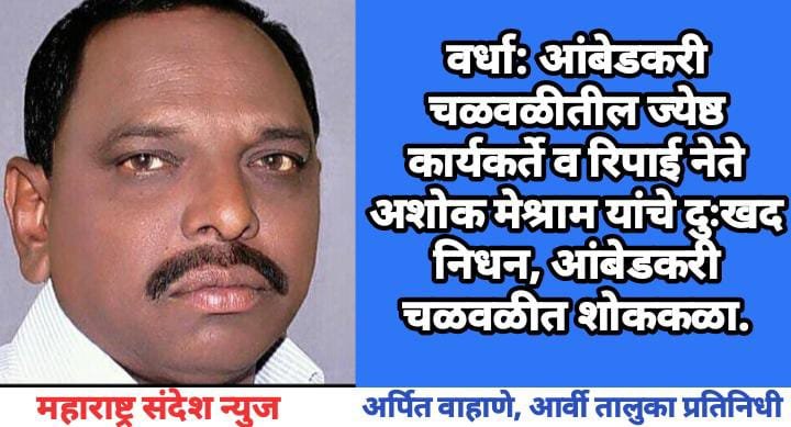 महाराष्ट्र संदेश न्युज ! ऑनलाईन वर्धा:- रिपब्लिकन आणि आंबेडकरी चळवळीतील ज्येष्ठ कार्यकर्ते अशोक मेश्राम यांचे दुःखद निधन झाल्याने आंबेडकरी चळवळीतील शोककळा पसरली आहे. अशोक मेश्राम सारखे लढाऊ व्यक्तिमत्त्व आज निघून गेल्याने आंबेडकरी चळवळीची न भरून निघणारी हानी झाली.