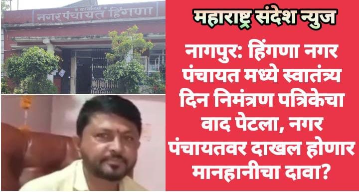 महाराष्ट्र संदेश न्युज ! ऑनलाईन नागपुर:- जिल्हातील हिंगणा नगर पंचायत मध्ये स्वातंत्र्य दिनाच्या निमंत्रण पत्रिकेवरून चांगलाच वाद पेटला आहे. हिंगणा नगर पंचायत विरोधात मानहानीचा दावा दाखल करण्यात येणार असल्याच्या वृत्ताने एकच खळबळ माजली आहे.