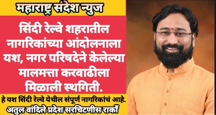 अव्याढव्य मालमत्ता कर चा संदर्भात सिंदी रेल्वे शहरातील नागरिकांनी विविध पक्षांनी सतत अडीच महिन्यापासून प्रभारी मुख्यधिकारी, जिल्हाधिकारी यांना निवेदने दिली, आंदोलने केली, सतत पाठपुरावा केला. शेवट या पाठपुराव्याला, सिंदी रेल्वे येथील जनतेला यश प्राप्त झालं हे यश समस्त सिंदी रेल्वे येथील संपूर्ण नागरिकांचं आहे. अतुल वांदिले प्रदेश सरचिटणीस राष्ट्रवादी काँग्रेस पार्टी