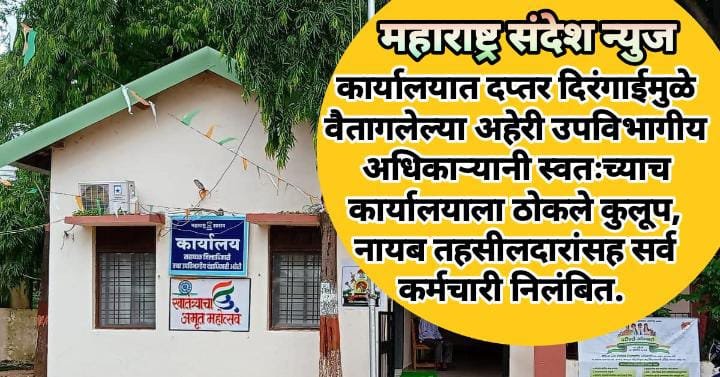 महाराष्ट्र संदेश न्युज ! ऑनलाईन गडचिरोली:- जिल्हा तील अहेरी तालुक्यातून एक खळबळजनक माहिती समोर आली आहे. येथील शासकीय कार्यालयात अनेक दिवसांपासून सुरू असलेल्या दप्तर दिरंगाईमुळे वैतागलेल्या अहेरी उपविभागीय अधिकारी वैभव वाघमारे यांनी स्वतःच्याच कार्यालयाला कुलूप ठोकून नायब तहसीलदारांसह सर्व कर्मचाऱ्यांना निलंबित केले. यामुळे जिल्ह्यात खळबळ उडाली आहे. तर त्रस्त नागरिकांनी वाघमारे यांच्या धडाकेबाज कारवाईचे कौतुक केले आहे.