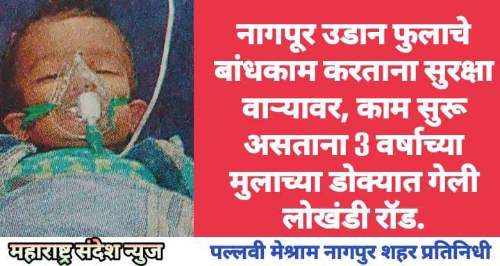नागपुर शहरातील पारडी फ्लाईओवर उडान फुलाचे निर्माण कार्य असताना खालच्या बाजूला दुचाकीने जात असलेले एका कामगाराच्या 3 वर्षीय चिमुकली मुलाच्या डोक्यात लोखंडी सलाख घुसली. त्यामुळे हे 3 वर्षीय मुलाच्या डोक्यात गंभीर मार लागला आहे. या मुलाला तडकाफडकी जवळच्या रुग्णालयात गंभीररित्या जखमी हालत मध्ये दाखल करण्यात आले. तेथे त्याच्यावर उपचार शुरू असून तो जीवन मरण्याला झुंज देत आहे.