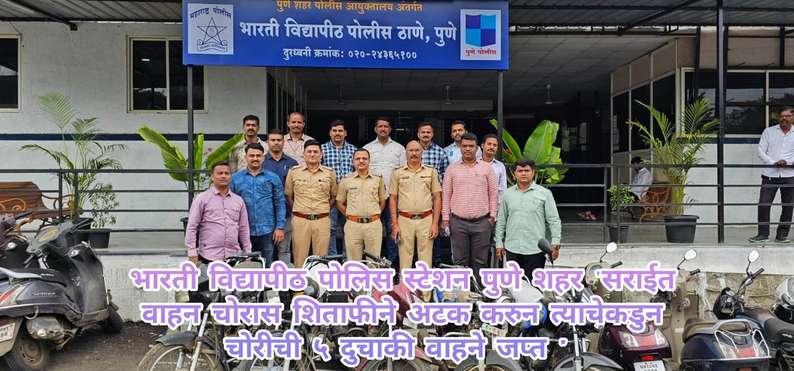 महाराष्ट्र संदेश न्यूज ! ऑनलाईन पुणे :- भारती विदयापीठ पोलीस स्टेशन हद्दीत वाहन चोरीचे प्रमाण वाढल्यामुळे मा. वरीष्ठ पोलीस निरीक्षक विनायक गायकवाड यांचे मार्गदर्शनाखाली भारती विद्यापीठ पोलीस स्टेशनकडील तपास पथकाचे अधिकारी व पोलीस अंमलदार है पोलीस स्टेशन हद्दीत पेट्रोलींग करीत असताना पोलीस अंमलदार धनाजी धोत्रे, हर्षल शिंदे, सचिन गाडे यांना त्याचे बातमीदारामार्फेतीने बातमी मिळाली की, रेकॉर्डवरील वाहन चोर कुणाल सुरेश बधे, वय २९ वर्षे, धंदा वायरमन, रा. मु.पो रांजणे, ता. वेल्हा, जि. पुणे हा अमृत खान, लिपाणे वस्ती येथे चोरीची दुचाकी गाडी घेवुन थांबला आहे अशी खात्रीशीर माहीती मिळाल्याने तपास पथकाचे अधिकारी व अंमलदार हे अमृत खान लिपाणे वस्ती गेले असता तेथे नमुद आरोपी दुचाकी गाडी MH128T1538 हीच्यासह मिळुन आल्याने त्यास ताब्यात घेवुन तपास करता त्याने सदरची गाडी चोरी केल्याची कबुली दिली असता त्या गाडीबाबत भारती विद्यापीठ पोलीस स्टेशन गुन्हा रजि नंबर ५६५ / २०२३ भादंवि कलम ३७९ या गुन्हयातील चोरीस गेले असल्याची निष्पन्न झाले असुन त्याचे ताब्यातील दुचाकी गाडी MH128T1538 ही जप्त करुन त्यास नमुद गुनहयात अटक केली आहे.आरोपी कुणाल सुरेश बधे, वय २९ वर्षे, धंदा वायरमन, रा. मु.पो रांजणे, ता. वेल्हा, जि. पुणे याचेकडे अटके दरम्यान तपास केला असता त्याचेकडुन एकुण ५ दुचाकी वाहने जप्त करण्यात आली असून आरोपीताकडुन खालील प्रमाणे गुन्हे उघडकीस आले आहेत.
