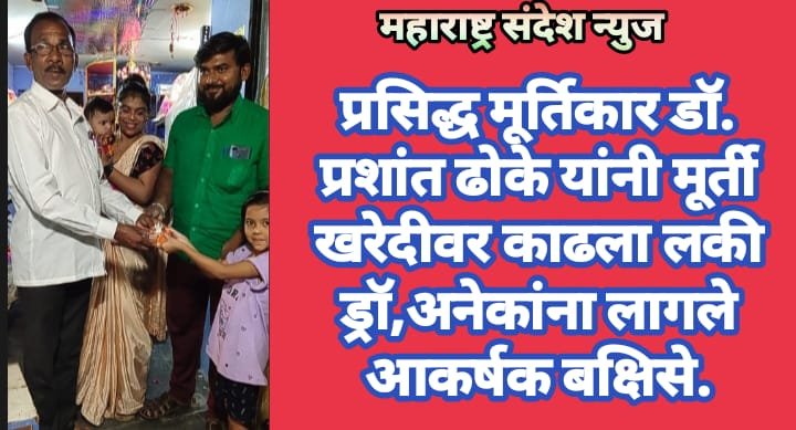 महाराष्ट्र संदेश न्युज ! ऑनलाईन सावनेर-26 सप्टेंबर:- वाघोडा येथील प्रसिद्ध गणपती मूर्तिकार डॉक्टर प्रशांत ढोके हे मागील अनेक वर्षांपासून मूर्ती बनवून विक्री करत असतात. ते सावनेर येथे गेल्या वीस वर्षापासून मूर्ती विक्रीचे दुकान लावत असून यावर्षी त्यांनी गणपती खरेदीवर लकी ड्रॉ कूपन योजना राबविली.