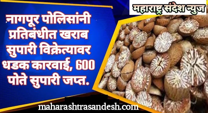 महाराष्ट्र संदेश न्यूज! ऑनलाइन नागपूर : नागपुर पोलिसांनी प्रतिबंधीत खराब सुपारी विक्रेत्यावर धडक कारवाई सुरू केली आहे. त्यामुळे शहरातील अनेक विक्रेत्यामध्ये धडक भरली आहे. या अगोदर नागपुर जिल्हात अन्न नागरी विभागाच्या वतीने विविध स्थिकाणी कारवाई करत कोट्यवधीची प्रतिबंधीत सडकी सुपारी जप्त केली होती.