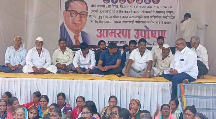 महाराष्ट्र संदेश न्युज ! ऑनलाईन सांगली दि. ५ ऑक्टोबर:- मौजे सलगरे ता. मिरज जिल्हा सांगली येथील गट क्र. ७३३/१, ७३६, ७५९ (सुमारे ३०० एकर) ही जमीन बॅकवर्ड क्लास सोसायटीचे सभासद कसून, त्यांच्या कुटुंबाचा उदरनिर्वाह करत असल्यामुळे सदर जमिनीवर मल्टी मॉडेल लॉजिस्टिक्स पार्कला किंवा कोणत्याही उद्योगाला ही जमीन देऊ नका या मागणीसाठी सलगरे येथील बंधू भगिनी सांगली जिल्हाधिकारी कार्यालयासमोर उपोषण करीत आहेत.