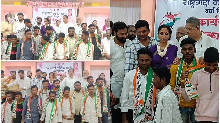 महाराष्ट्र संदेश न्युज ! ऑनलाईन हिंगणघाट:- राष्ट्रवादी काँग्रेस पक्षाच्या राष्ट्रीय कार्याध्यक्षा विदर्भाच्या दौऱ्यावर आल्याअसता संसदरत्न खासदार सुप्रियाताई सुळे, माजी गृहमंत्री अनिल देशमुख, महिला प्रदेशाध्यक्ष रोहिणी खडसे, युवक प्रदेशाध्यक्ष महेबूब शेख, अल्पसंख्याक प्रदेशाध्यक्ष जावेद हबीब यांचा वर्धा येथे पदाधिकारी व कार्यकर्ता मेळाव्यात राष्ट्रवादी कॉंग्रेस पक्षाचे प्रदेश सरचिटणीस अतुल वांदिले यांच्या कार्याला प्रभावित होऊन हिंगणघाट विधानसभा क्षेत्रातील अनेक पक्षाच्या कार्यकर्त्यांनी राष्ट्रवादी काँग्रेस पक्षात पक्ष प्रवेश केला.