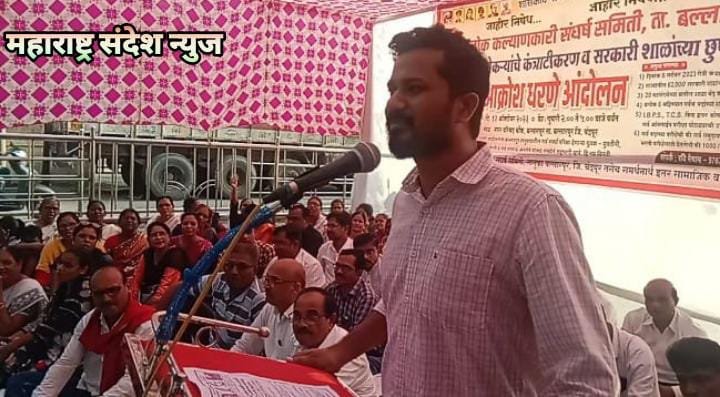 महाराष्ट्र संदेश न्युज ! ऑनलाईन चंद्रपूर:- महाराष्ट्र शासनाच्या बाह्य यंत्रणेमार्फत कंत्राटी नोकर भरती व शाळा खाजगीकरणाबाबतचा जाचक व अत्यंत घातक शासन निर्णयाविरुद्ध बल्लारपूर तालुक्यातील प्रत्येक गावातील सुशिक्षित बेरोजगार युवक – युवती महाविद्यालयीन विद्यार्थी, कंत्राटी कर्मचारी, शेतकरी, शेतमजूर, कामगार, सामाजिक व शैक्षणिक संघटना, शासकीय कर्मचारी यांच्या एकजुटीने लोककल्याणकारी संघर्ष समिती बल्लारपूर तालुका तसेच समर्थनार्थ इतर सामाजिक व शैक्षणिक संघटनाच्या वतीने जनआक्रोश धरणे आंदोलन दिनांक 13 ऑक्टोंबर 2023 रोजी दुपारी 2 ते 5 वाजेपर्यंत नगरपरिषद चौक बल्लारपूर येथे आयोजित करण्यात आले होते.