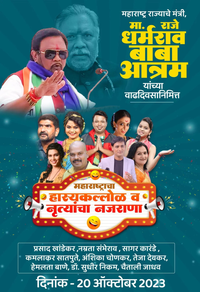 महाराष्ट्र संदेश न्युज ! ऑनलाईन अहेरी:- राज्याचे अन्न व औषध प्रशासन मंत्री राजे धर्मराव बाबा आत्राम यांच्या 20 ऑक्टोबर रोजी होणाऱ्या वाढदिवसानिमित्त अहेरी राजनगरीत पहिल्यांदाच हास्यकल्लोळ व नृत्यांचा नजराणा कार्यक्रमाचे आयोजन करण्यात आले आहे.