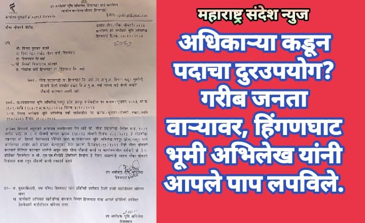 महाराष्ट्र संदेश न्युज ! ऑनलाईन हिंगणघाट:- शासन आणि प्रशासन हे सर्व सामान्य नागरिकांना न्याय देण्यासाठी कार्यरत असले पाहिजे पण जेव्हा हेच प्रशासन नागरिकांवर अन्याय करत असेल तर दाद मागायची तरी कुणाला असे प्रश्न निर्माण झाला आहे.