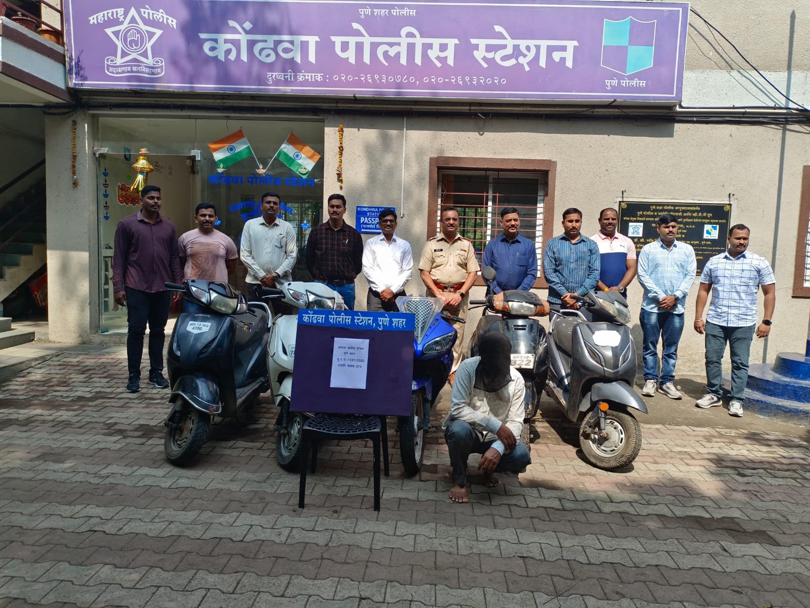 महाराष्ट्र संदेश न्यूज ऑनलाईन पुणे :- कोंढवा पोलीस ठाणे हद्दीत वाढलेल्या वाहन चोरीच्या अनुषंगाने पेट्रोलिंग करुन अचानक वाहन चेकिंग करुन चोरीची वाहनाचा शोध घेण्याबाबत वरिष्ठ पोलीस निरीक्षक संतोष सोनवणे, पोलीस निरीक्षक (गुन्हे) संजय मोगले, पोलीस निरीक्षक (गुन्हे) संदिप भोसले यांनी सुचना दिल्या होत्या. सदर सुचनाप्रमाणे तपास पथक अधिकारी सहा. पोलीस निरीक्षक लेखाजी शिंदे सहा पोलीस निरीक्षक दिनेश पाटील, पोलीस अंमलदार अमोल हिरवे, राहुल बंजारी, सुहास मोरे, राहुल थोरात, अभिजीत रत्नपारखी, जयदेव भोसले, विकास मरगळे, शशांक खाडे, आशिष गरुड, रोहित पाटील, राहुल रासगे असे गुप्त बातमीदारा मार्फतीने, रहदारीच्या ठिकाणी अचानक वाहन चेकिंग करुन तसेच वयाने कमी असणारे जी मुले गाडी चालवत आहे, त्यांना तपासुन वाहने चेक करुन चोरीच्या वाहनाचा शोध घेत असताना दि. ०७/११/२०२३ रोजी आशिर्वाद चौकात आलो असताना पोलीस अंमलदार सुहास मोरे, राहुल थोरात, जयदेव भोसले, विकास मरगळे यांना गुप्त माहिती मिळाली होती की, एक ग्रे रंगाचे जर्किग घातलेला इसम हा खड़ी मशीन चौकातील चहाच्या टपरीच्या शेजारी थांबलेला असुन त्याच्याकडे असणाऱ्या पांढन्या रंगाच्या मोटार सायकल वर नंबर प्लेट नसुन सदर मोटार सायकल विकण्यासाठी तो ग्राहक शोधत असुन गाडीची कागदपत्र नंतर देतो असे सांगत आहे. त्याच्याकडे असणारी मोटार सायकल ही चोरीची असल्याचा संशय आहे. तेव्हा वरिल स्टाफच्यासह मिळालेल्या बातमीच्या ठिकाणी जावून खात्री केली असता खड़ी मशीन चौकातील चहाच्या टपरीच्या शेजारी एक इसम बसलेला दिसुन आला. त्यास पकडण्याकरिता गेलो असता त्याला चाहुल लागली असता तो वॉल कंपाऊंन्ड वरून उडी मारुन पळुन जावु लागला. तेव्हा त्यास वरिल स्टाफच्या मदतीने पकडून त्यास ताब्यात घेवुन त्याचे नाव पत्ता विचारता अमन अलीम शेख, वय २५ वर्षे, रा. नवाजिश पार्क, कुबा मस्जिदच्या जवळ, मदिना मंजिल बिल्डींग, कोंढवा खुा पुणे असे असल्याचे सांगितले. सदर इसमाकडे असणाऱ्या अँटिव्हा मोटार सायकल बाबत त्याच्याकडे चौकशी केली असता तो उडवाउडवीची व असमाधानकारक उत्तरे देवु लागला. तेव्हा त्यास पोलीस ठाणेस आणुन त्याच्याकडे सखोल तपास केला असता सदर इसमाकडे मिळुन आलेली गाड़ी ही कोंढवा पोलीस ठाणे पुणे येथे गुरन. ११३१ / २०२३ भादवि कलम ३७९ प्रमाणे दाखल असणाऱ्या गुन्हयातील चोरी गेली असल्याचे निष्पन्न झाले आहे. सदर आरोपी हा रेकार्डवरिल वाहन चोरी करणारा आरोपी असल्याने त्याच्याकडे सखोल तपास करुन त्याच्याकडुन १) एम.एच.१२/ एल. आर. ७८५१ होन्डा अॅक्टीव्हा मोपेड २) एम.एच.१२टी. एन. ०७५६ अॅक्टिव्हा ३) एम. एच. १२