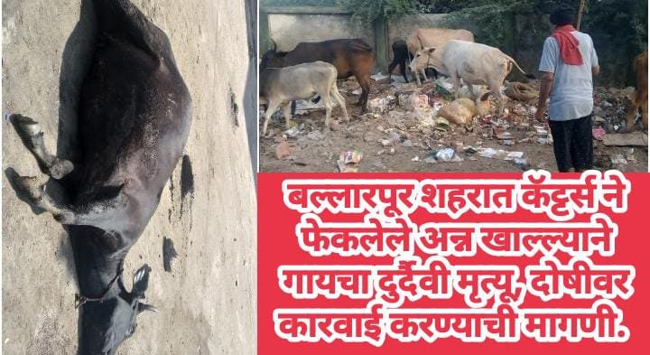 कॅट्टर्स ने फेकलेले अन्न खाल्ल्याने गायचा मृत्यू झाल्याची घटना शहरातील रविंद्र वार्ड मध्ये घडली. शहरातील लॉन, मंगल कार्यालय मध्ये विवाह सोहळा, घरगुती कार्यक्रम मध्ये कॅटर्स कडून जेवण बनविले जातात. ज्यामध्ये रात्री उरलेले अन्न किंवा खराब झालेले अन्न रस्त्याच्या कडेला असलेल्या जंगलात फेकले जाते, जे लोकांचे पाळीव प्राणी खातात व त्यात त्यांचा मृत्यू होत आहे.