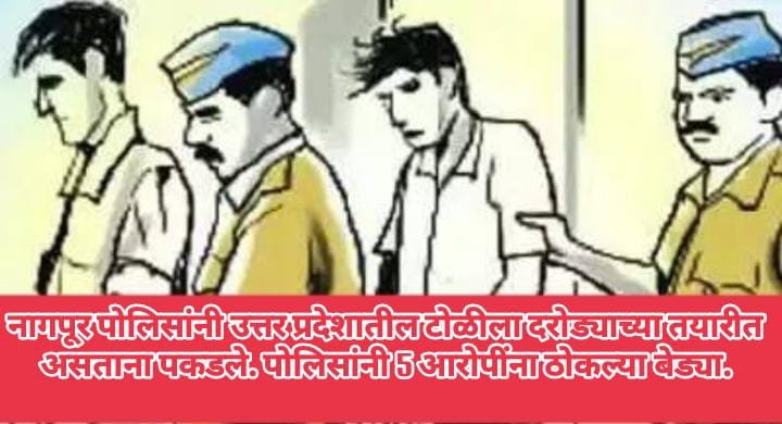 नागपूर गुन्हे शाखा युनिट 5 च्या पथकाने नवीन कामठी पोलीस स्टेशन हद्दीत येणाऱ्या परिसरात गस्तीदरम्यान उत्तर प्रदेशातील एका टोळीला दरोड्याच्या तयारीत असताना पकडले. पोलिसांनी 5 आरोपींना बेड्या ठोकल्या असून त्यांच्या कडून शस्त्रास्त्रासह 15 लाख 44 हजार 600 रुपयांचा माल जप्त केला. ही टोळी कुठेतरी मोठा दरोडा टाकण्याचा तयारीत होती, असा अंदाज पोलिसांनी वर्तविला आहे.