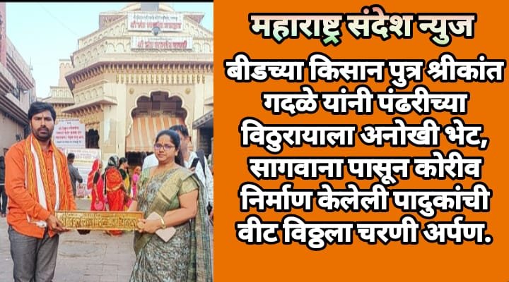 महाराष्ट्र संदेश न्युज ! ऑनलाईन बीड:- महाराष्ट्र राज्यातील शेतकऱ्यांच्या हितासाठी शेतकऱ्यांच्या आत्महत्या रोखण्यासाठी आणि शेतकऱ्यावर संकट येऊ नये म्हणून बीडच्या किसान पुत्र श्रीकांत गदळे याने पंढरीच्या विठुरायासाठी सागवान निर्मित कोरीव अशी पादुकांची विट तयार केली आहे. त्या विटेचे वजन 11 किलो 700 ग्राम आहे. आणि ती विट पंढरीनाथाच्या चरणी अर्पण केली आहे.