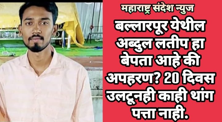 महाराष्ट्र संदेश न्युज ! ऑनलाईन बल्लारपूर:- शहरातून एक खळबळजनक घटना समोर आली आहे. येथील रहिवासीअब्दुल लतीफ शेख हा तरुण आरटीओ ऑफिस चंद्रपूर येथून २० दिवसापूर्वी अचानक बेपत्ता झाला आहे तशी तक्रार त्याच्या कुटुंबीयांनी रामनगर पोलीस स्टेशन येथे बेपत्ताची दिलेली आहे. मात्र वीस दिवस उलटूनहि त्याचा काही थांग पत्ता लागत नसल्याने त्त्याची आई आसमा कौसर हिने माझा मुलगा बेपत्ता नसून त्याचा अपहरण तर करण्यात आले नाहि ना अशी शंका व्यक्त केली आहे.